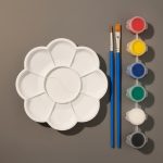 de madera, pinturas, pincel y mezclador.