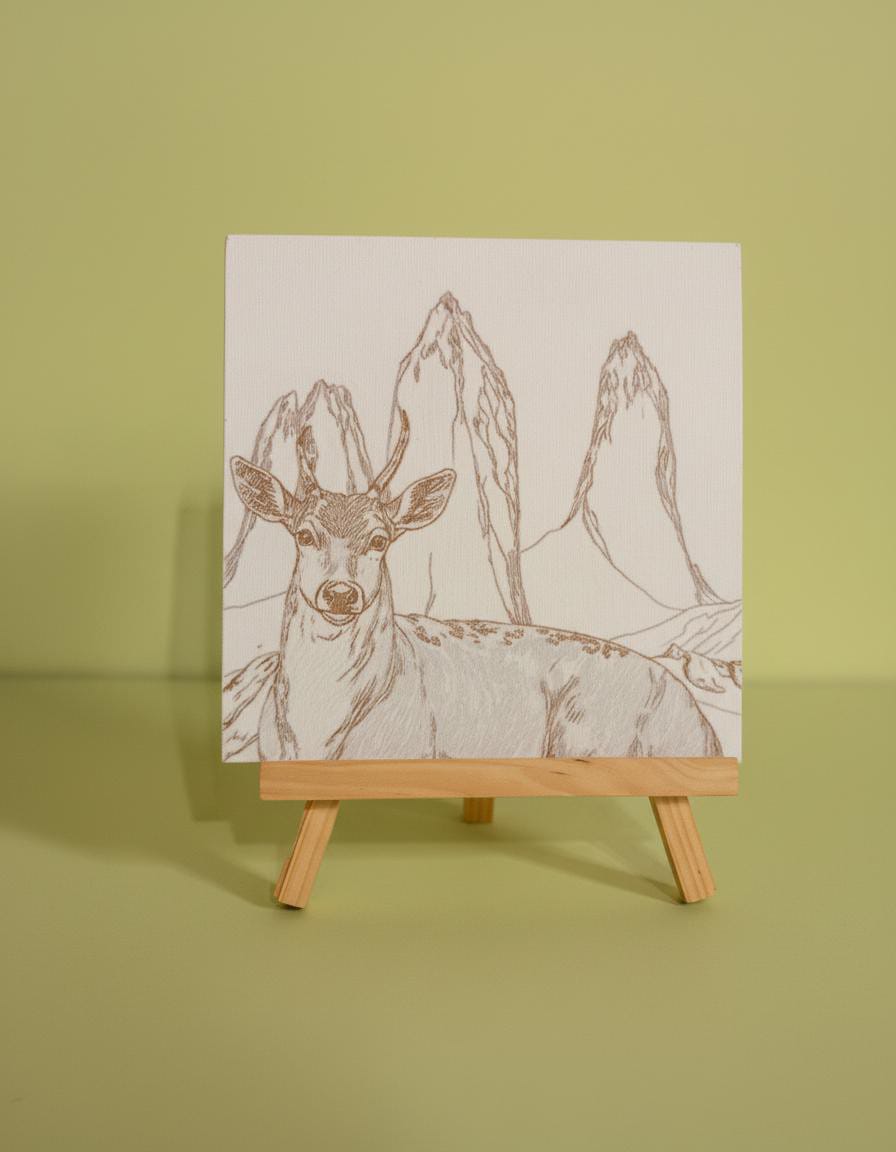 Kit creativo con mini lienzo ilustrado de animales nativos chilenos, acompañado de atril